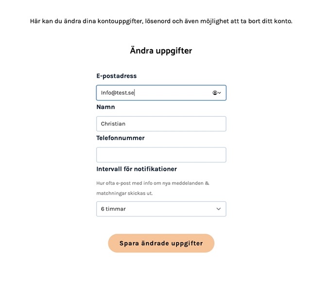 För att byta lösenord, e-post eller telefonnummer loggar du först in längst uppe i högra hörnet på startsidan under "Logga in" Därefter väljer du "Ditt konto" och sen "konto" i listan. Du får då upp en överskådlig bild för att enkelt byta lösenord, e-post elle telenummer. Vill du av någon anledning ta bort ditt konto helt kan du göra det via den röda knappen längst ner på sidan. Du måste vara inloggad för att kunna byta uppgifter och ta bort konto