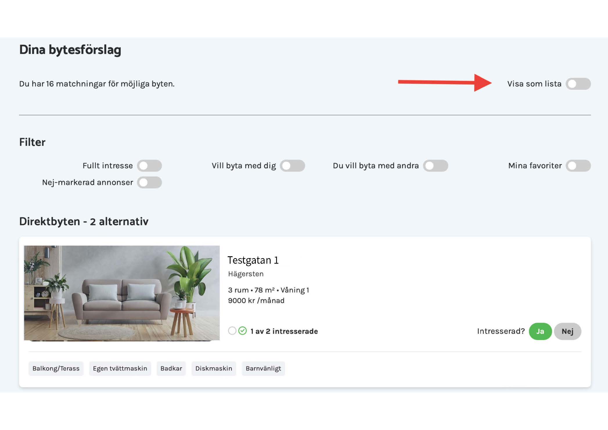 När du besöker byteslistan visas varje bostad som matchar din lägenhet som en mindre annons med bild och mer information om bostaden som matchar det du söker. Detta är en bra översikt när man inte har så många matchningar på sin annons. Det är också den översikt som först visas när man öppnar sin byteslista. Om man däremot har väldigt många matchningar kan man växla till en enklare lista med bytesförslag som du mer överskådligt kan överblicka. För att byta till en lista så gör du det enkelt med det lilla reglaget högst upp i listan som heter "Visa som lista". (Se pratbubbla) Läs längre ner om hur du kan ha nytta av denna lista