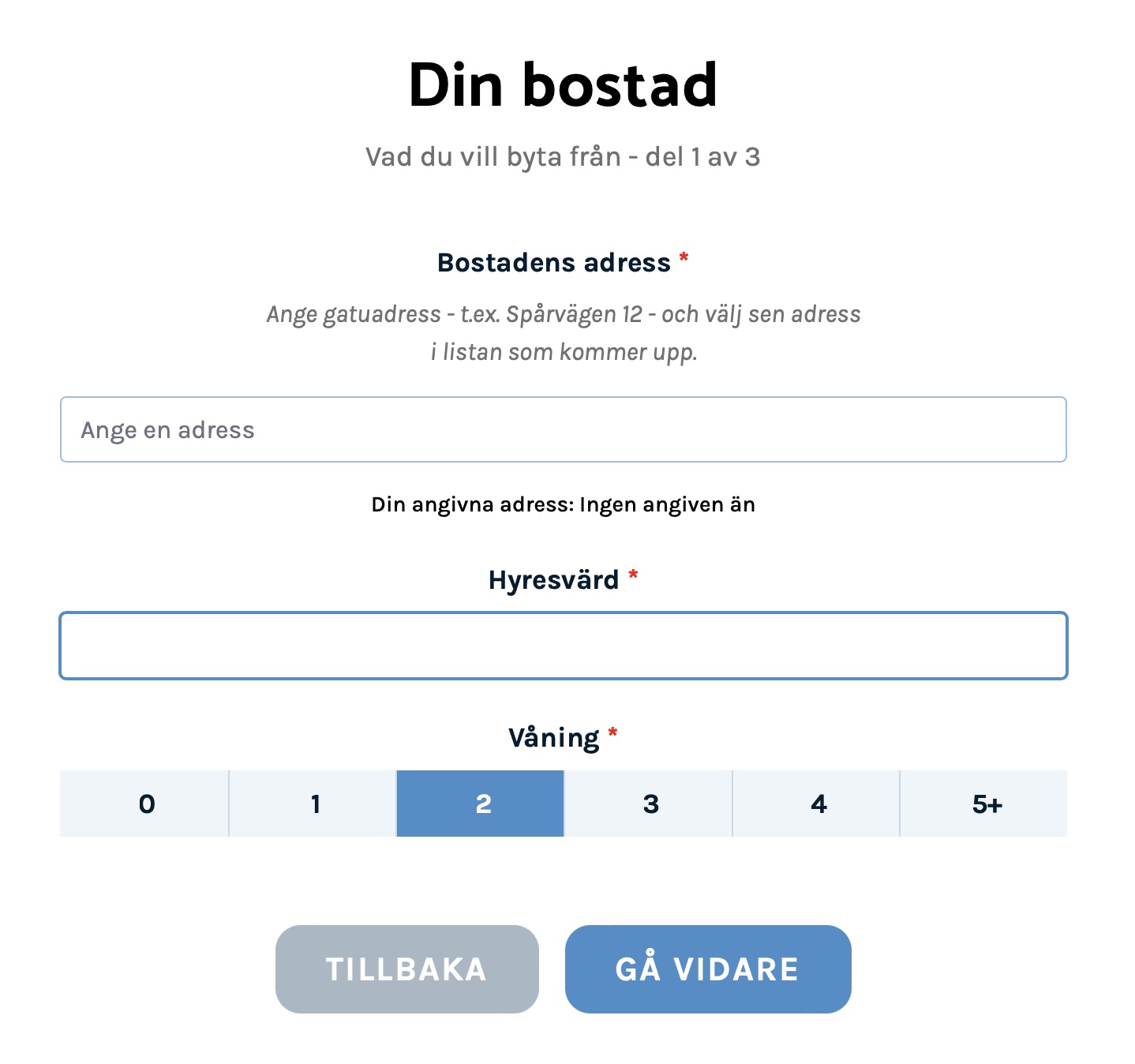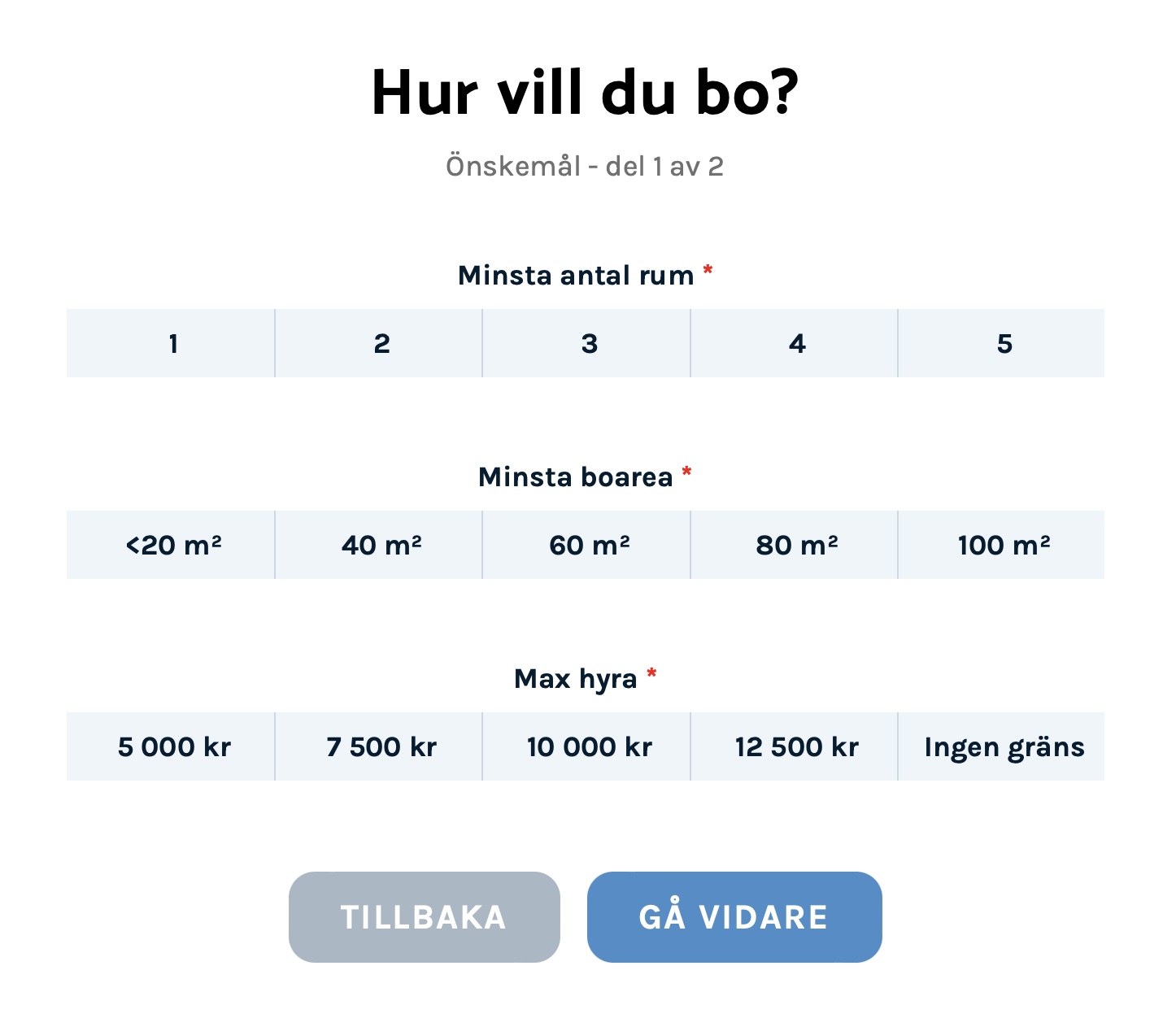 - I steg två beskriver du hur du vill bo (alltså vad du söker) genom att enkelt kryssa i färdiga boxar med frågor om din bostad. Om du/n söker två lägenher (Som i fallet om du valt 1 bostad mot 2) kommer samma frågor upp två gånger.
