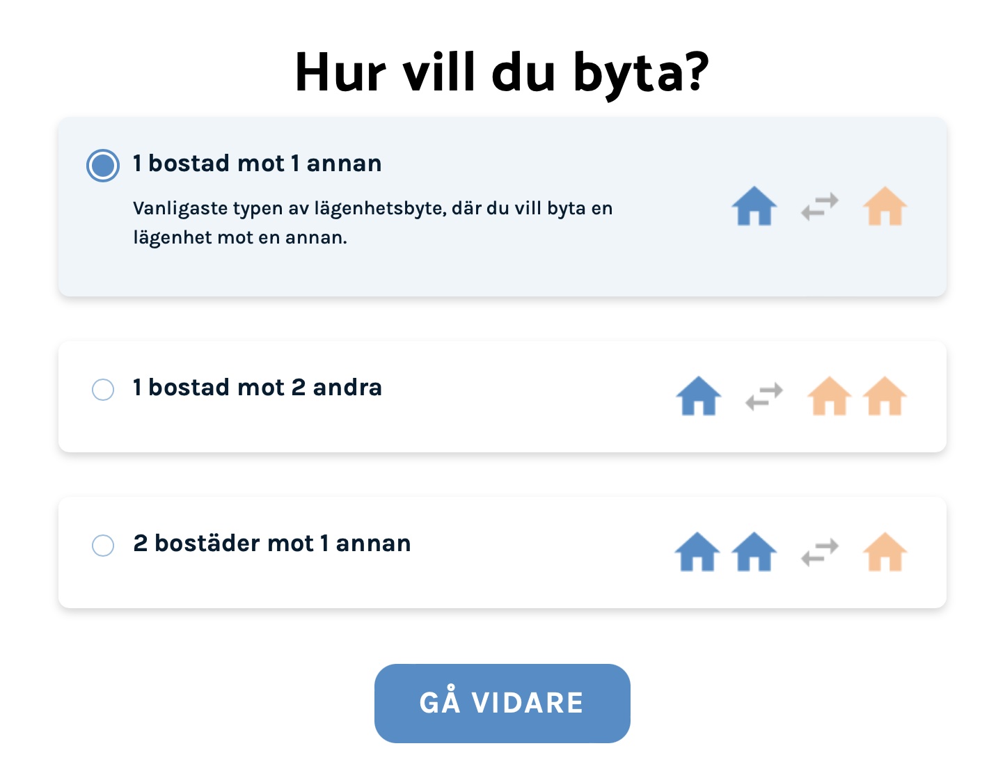 - Första steget efter att du tryckt på knappen för att skapa en annons är att först välja vilken typ av lägenhetsbyte du vill göra.